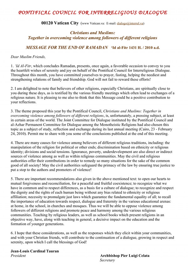 08/09/201009/09/2010 Christianity, culture, faith, God, interfaith, Islam, Muslims, peace, religion, spirituality, unity Leave a comment AllahCatholicChristianChristianityculturedialoguefriendshipGodharmonyIslamLightMuslimspeacePopeRamadanspiritualityunityVatican