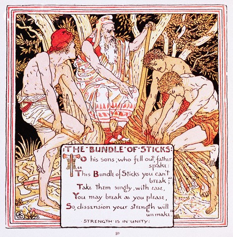 AN OLD man on the point of death summoned his sons around him to give them some parting advice. He asked his servants to bring in a bundle of sticks, and said to his eldest son: “Break it.” The son strained and strained, but with all his efforts was unable to break the bundle. The other sons also tried and tried again, but none of them were successful. “Untie the sticks,” said the father, “and each of you take a stick.” When they had done so, he called out to them: “Now, break,” and each stick was easily broken. “You see my meaning,” said their father…