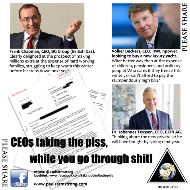 To contribute to these ‘greedy bastards’ just look out for your nearest British Gas, Npower and E.ON representatives, the ones that usually drive around in flash new cars, 4x4s, private jets and yachts – after all they need your shit! ^_^