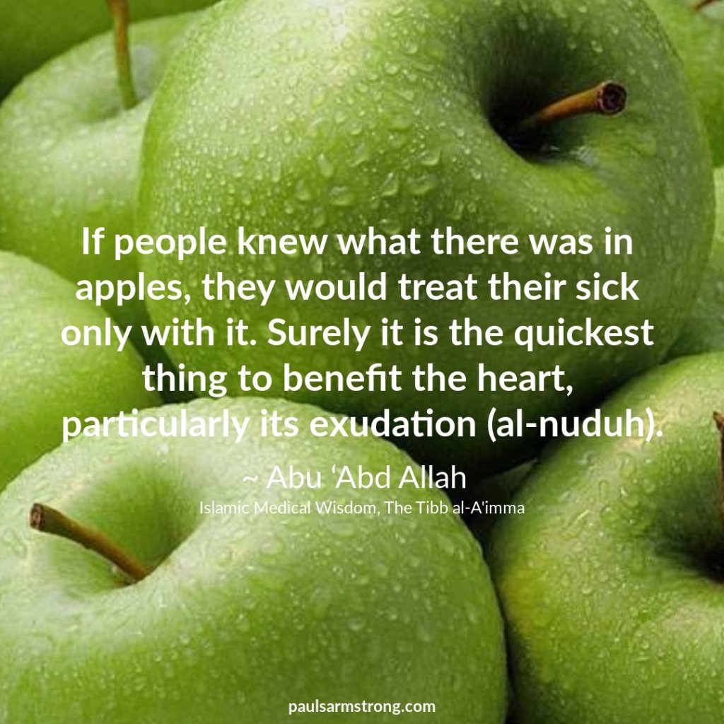 Jabir b. ‘Umar al-Saksaki narrated from Muhammad b. ‘Isa from Ayyub b. Faddala from Muhammad b. Muslim, who said: Abu ‘Abd Allah, peace be upon him, said: “If people knew what there was in apples, they would treat their sick only with it. Surely it is the quickest thing to benefit the heart, particularly its exudation (al-nuduh).”