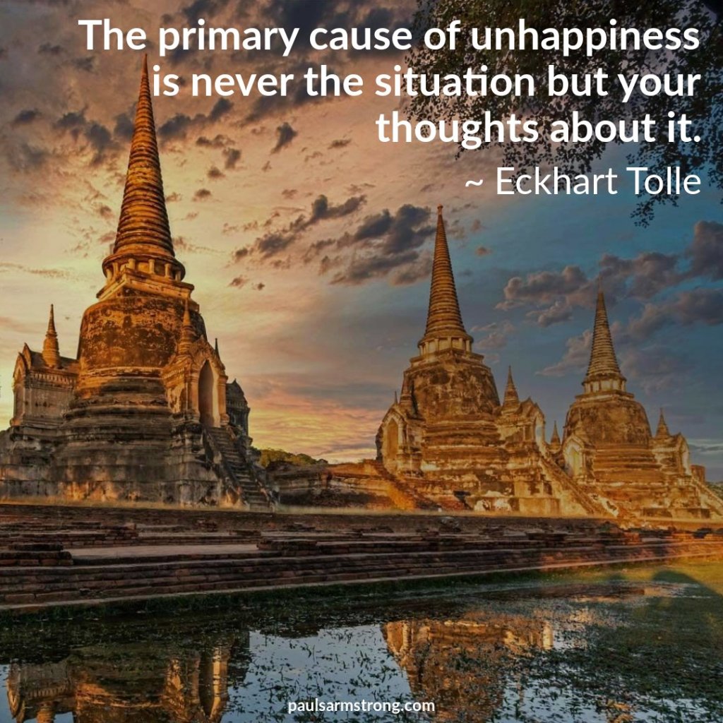 “The primary cause of unhappiness is never the situation but your thoughts about it. Be aware of the thoughts you are thinking. Separate them from the situation, which is always neutral, which always is as it is.”