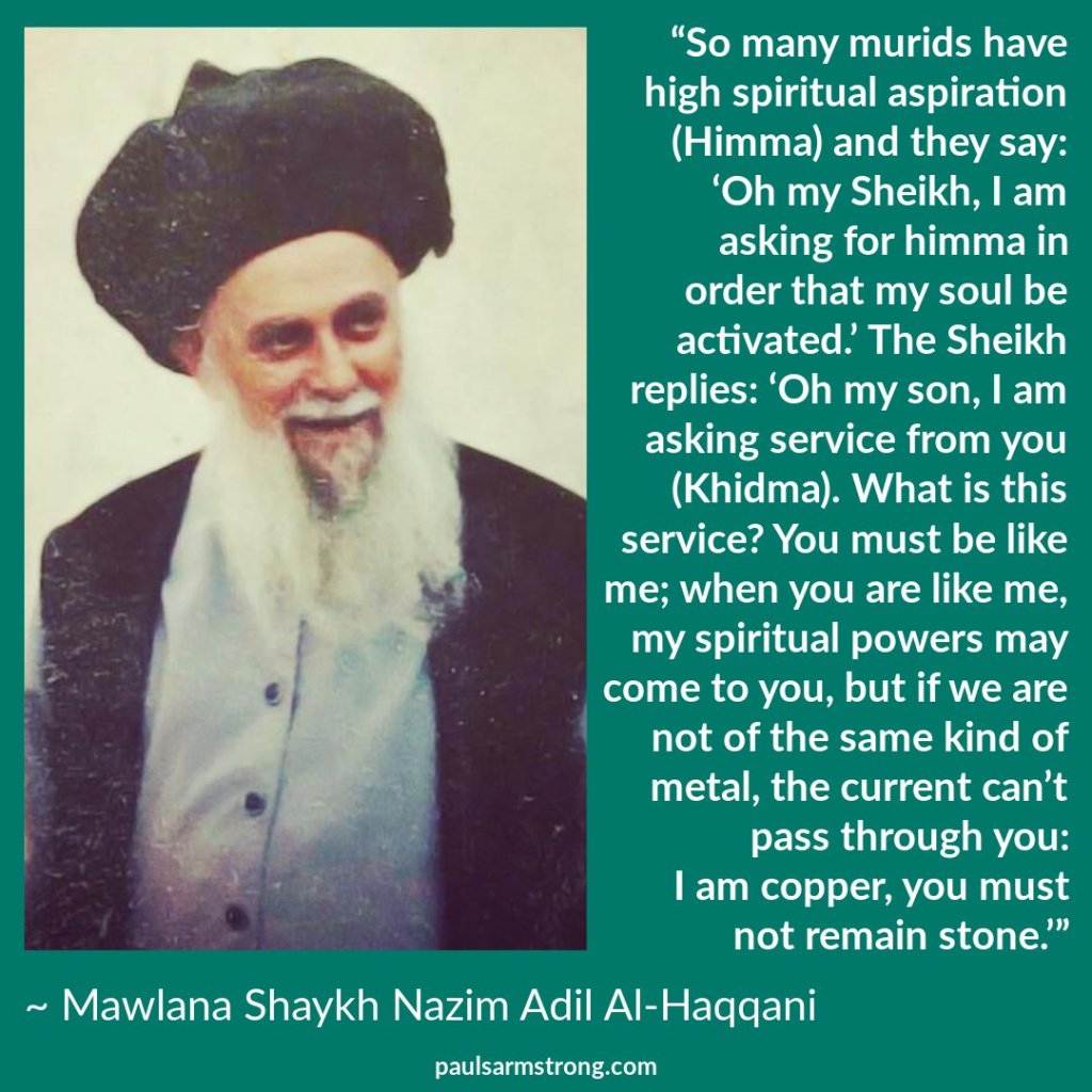“The Tariqat-an-Naqshbandiyya, (as it is passed down through Abu Bakr As-Siddiq), activates the souls of the murids to whatever extent the murid can bring his desires to accord with the desires of his Sheikh. So many murids have high spiritual aspiration (Himma) and they say: ‘Oh my Sheikh, I am asking for himma in order that my soul be activated.’ The Sheikh replies: ‘Oh my son, I am asking service from you (Khidma). What is this service? You must be like me; when you are like me, my spiritual powers may come to you, but if we are not of the same kind of metal, the current can’t pass through you: I am copper, you must not remain stone.’”