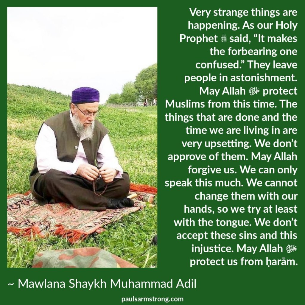Very strange things are happening. As our Holy Prophet ﷺ said, “It makes the forbearing one confused.” They leave people in astonishment. May Allah ﷻ protect Muslims from this time. The things that are done and the time we are living in are very upsetting. We don’t approve of them. May Allah ﷻ forgive us. We can only speak this much. We cannot change them with our hands, so we try at least with the tongue. We don’t accept these sins and this injustice. May Allah ﷻ protect us from ḥarām.”