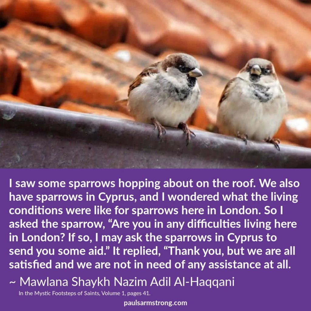 Look, those sparrows are pleased with their Lord, and Allah is pleased with those who are pleased with Him. Therefore, you must seek ways to make Allah pleased with you. We walk this Earth with a heavy burden of ego, and of course it is impossible for us to be so light, to flutter and twitter without a care in the world like sparrows, but we can emulate their ways in the trust of God. He Almighty is the Only One who can guarantee your future: you cannot determine what will happen to you, and you cannot know what accidents or misfortunes may befall you, your spouse, your children, nation, or business. Don’t put your trust in your job, your power, your knowledge or your beauty, for it may be that none of this will avail you when you are the most vulnerable.