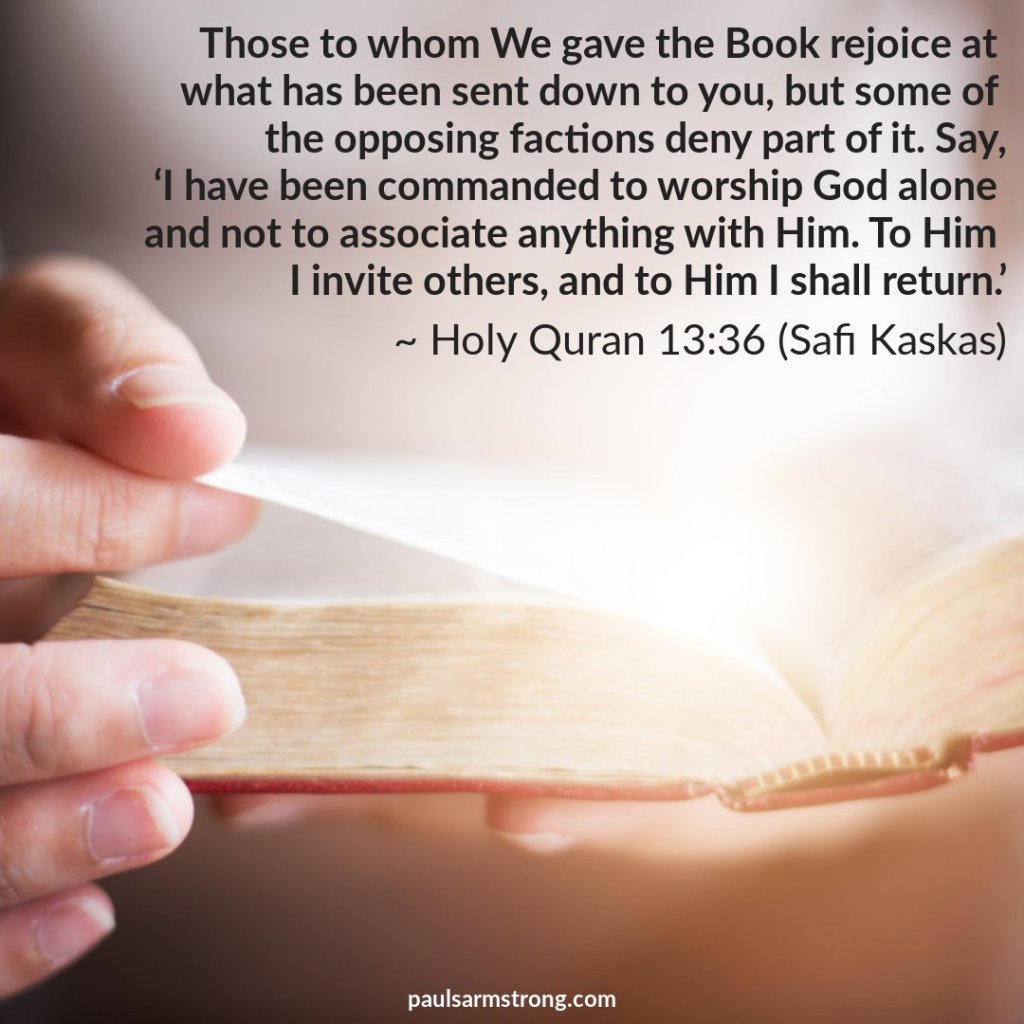 “Those to whom We gave the Book rejoice at what has been sent down to you, but some of the opposing factions deny part of it. Say, ‘I have been commanded to worship God alone and not to associate anything with Him. To Him I invite others, and to Him I shall return.’”