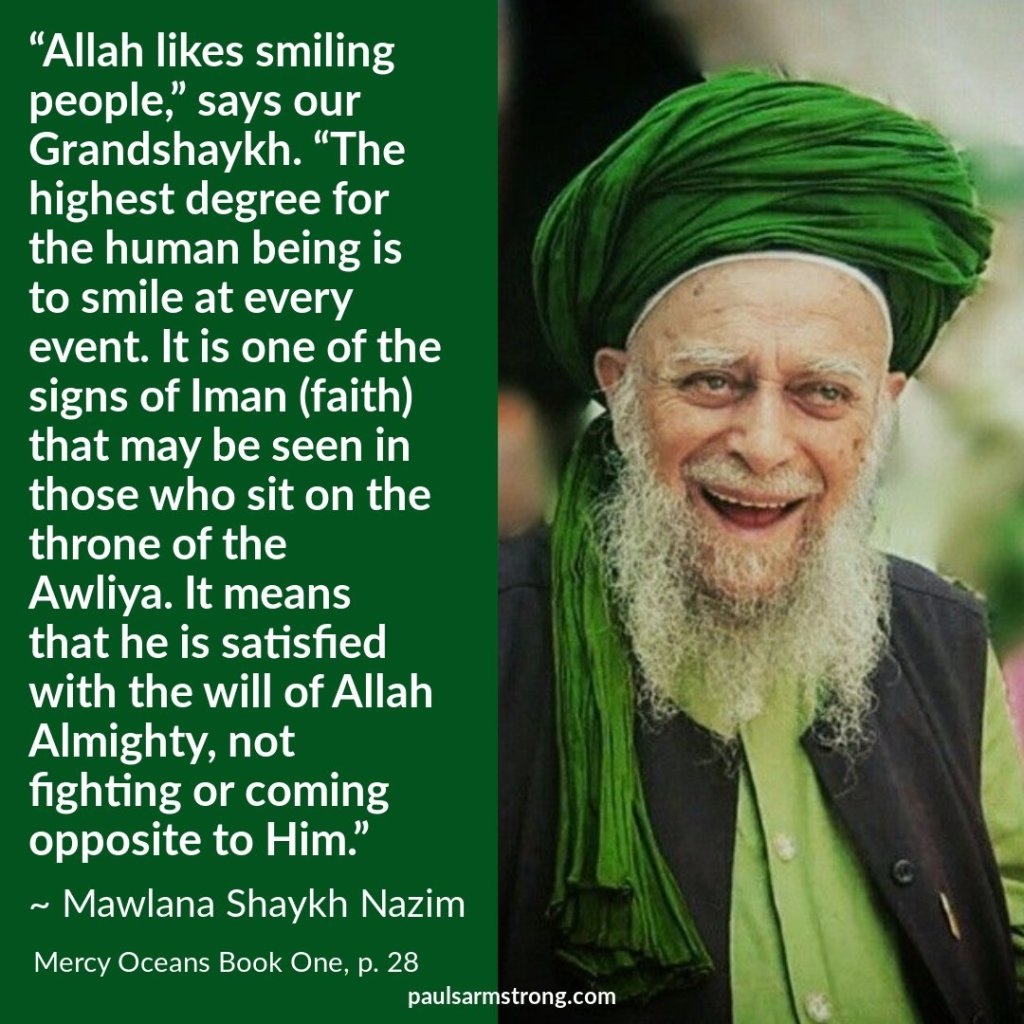 “Allah likes smiling people,” says our Grandshaykh. “The highest degree for the human being is to smile at every event. It is one of the signs of Iman (faith) that may be seen in those who sit on the throne of the Awliya. It means that he is satisfied with the will of Allah Almighty, not fighting or coming opposite to Him.”