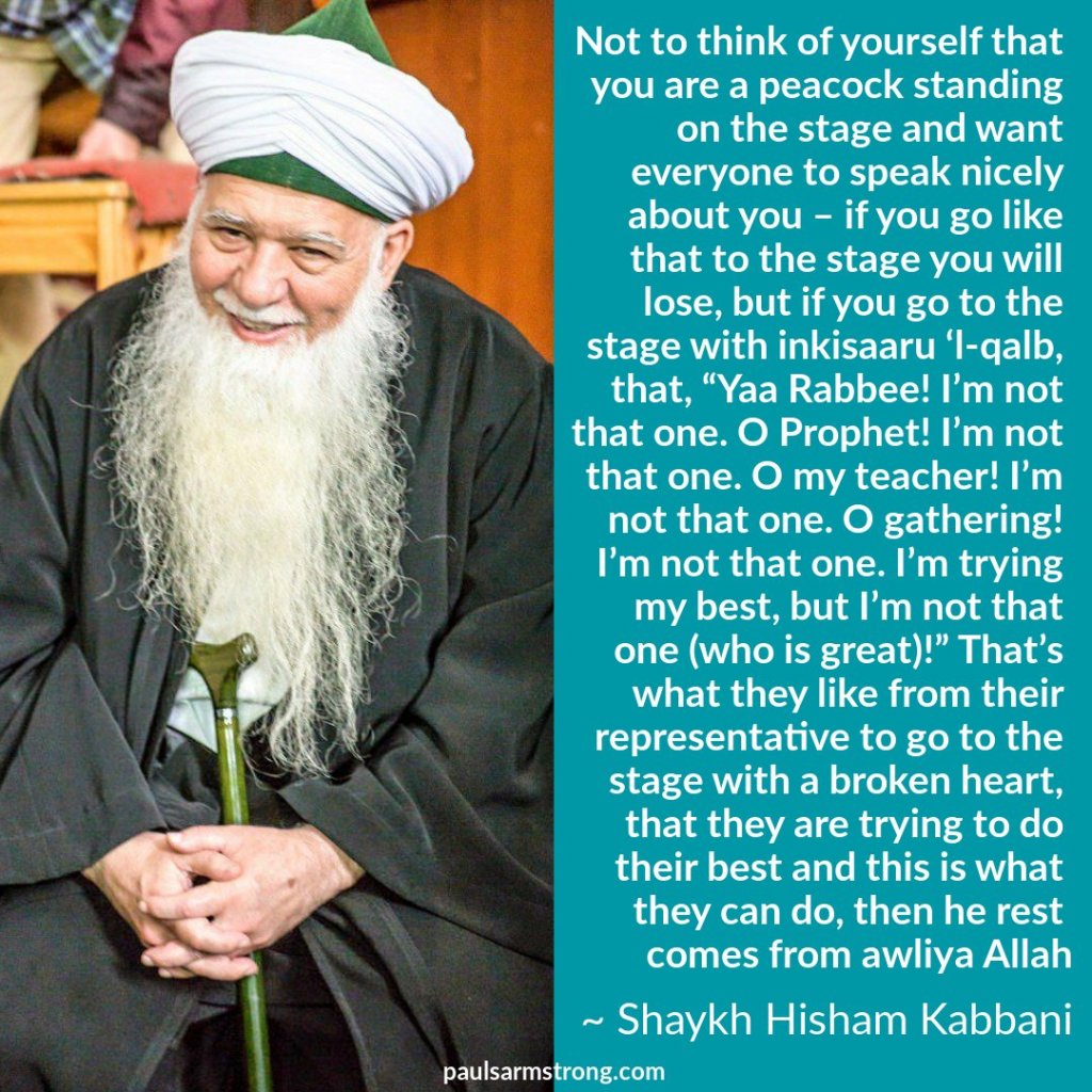If you go like that to the stage you will lose, but if you go to the stage with inkisaaru ‘l-qalb, that, “Yaa Rabbee! I’m not that one. O Prophet! I’m not that one. O my teacher! I’m not that one. O gathering! I’m not that one. I’m trying my best, but I’m not that one (who is great)!” That’s what they like from their representative to go to the stage with a broken heart, that they are trying to do their best and this is what they can do, then he rest comes from awliya Allah.